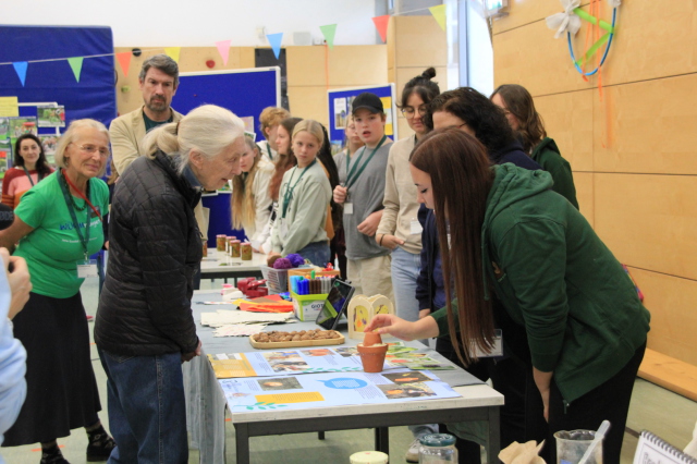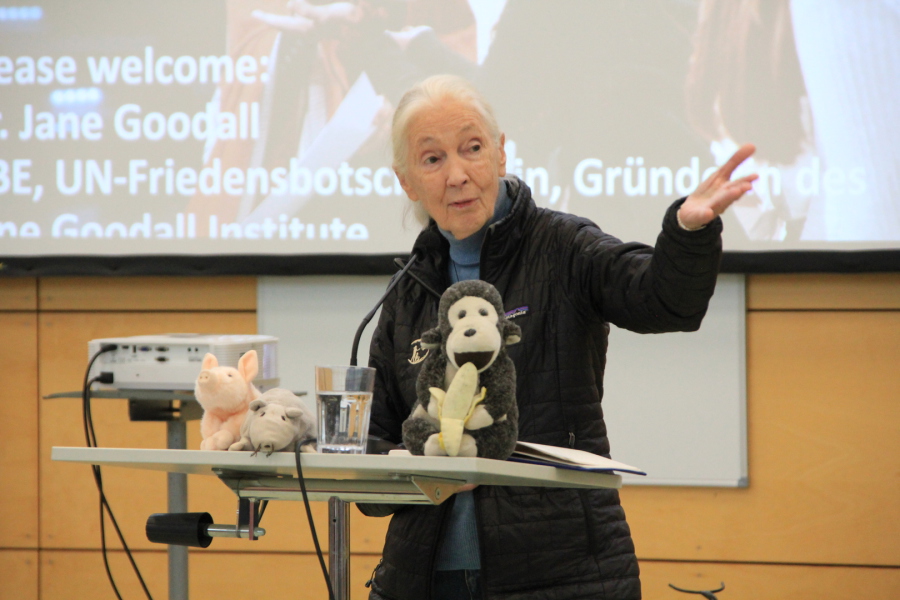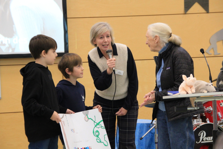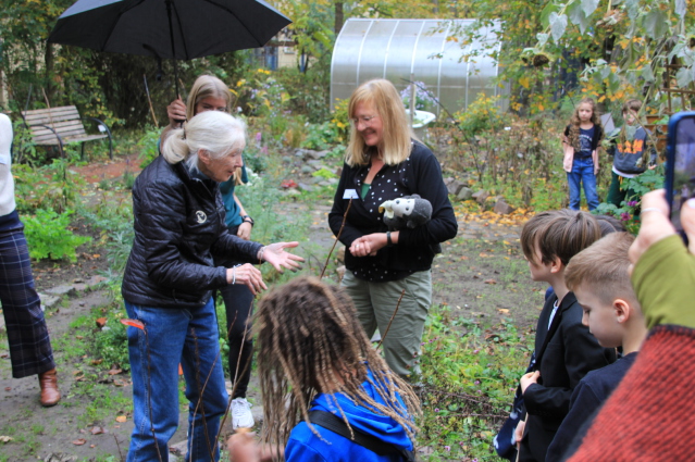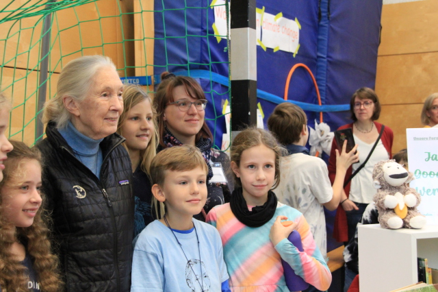 Jane Goodall hat uns besucht: Am Mittwoch, 30.10., kam sie zum zweiten Mal an unsere Schule, um mit uns verschiedene Roots&Shoots-Gruppen zu treffen und einen kleinen "Day of Hope" mit uns zu feiern.