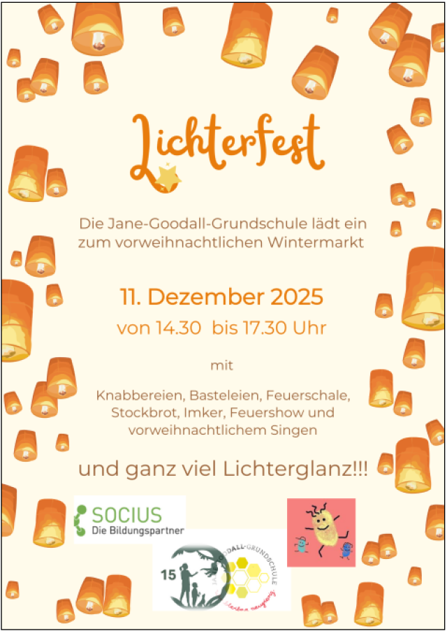 Am 11. Dezember feiern wir mit der Schulgemeinschaft — allen Kindern, Eltern, Angehörigen und Ehemaligen — unser Lichterfest. Mehr Infos folgen im November nach den Ferien, aber schon jetzt gilt: Tragt euch den Termin in den Kalender ein, damit ihr nichts verpasst!
